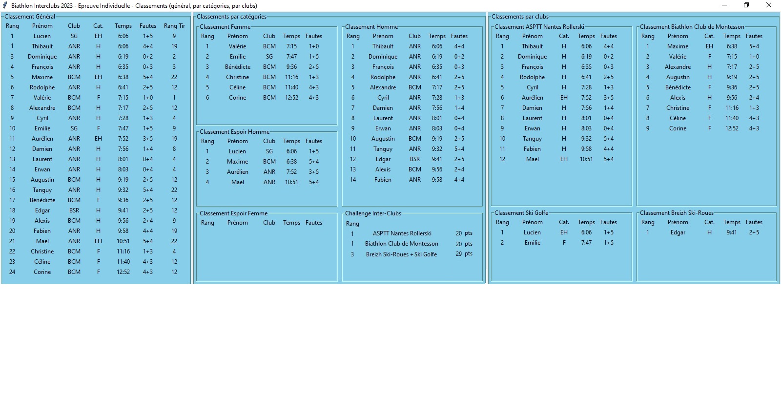 - Au challenge interclubs (sur les 3 meilleurs biathlètes), le Biathlon Club de Montesson et l'ASPTT Nantes Rollerski finissent également ex-aequo, devant le regroupement Ski Golfe/Breizh Ski-Roues