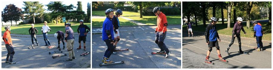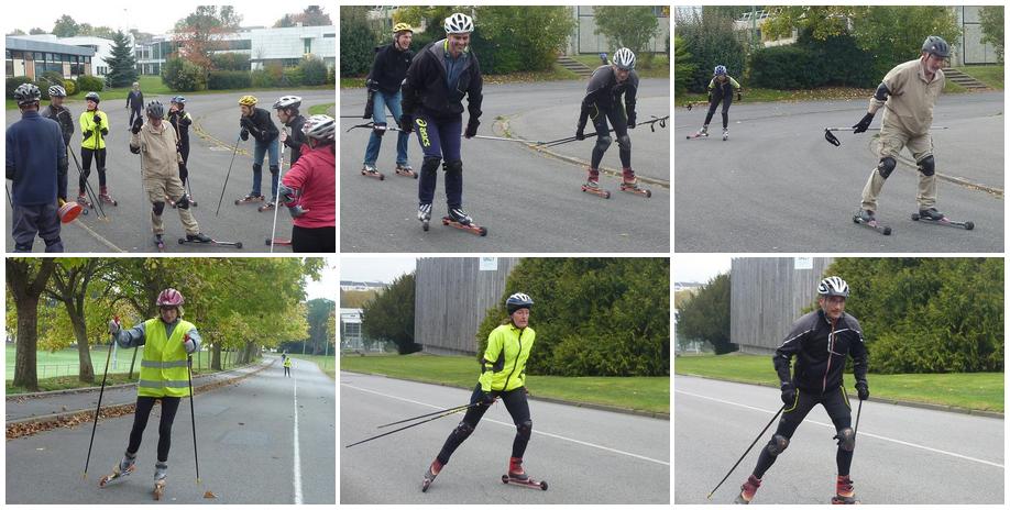 En milieu de matinée, après un café d'accueil et une séance d'échauffement musculaire, une quinzaine de skieuses et skieurs, ainsi que deux accompagnateurs à vélo s'élancèrent, en deux groupes, pour un ou deux tours du circuit d'entrainement vallonné (8,3 km avec 80 m de dénivelé) de l'ASPTT Nantes Rollerski, à travers les vignobles, du côté du Landreau.